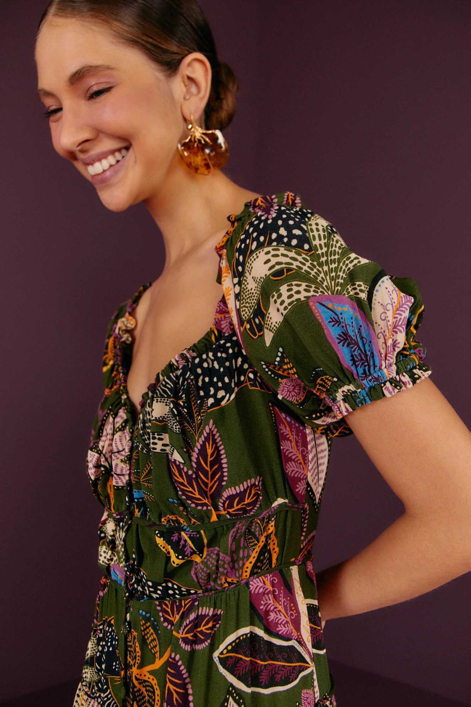 Awe-inspiring fauna and flora just jumped into your season. The Green Wild Jungle Corset Midi Dress features a cozy silhouette with a flowy skirt and a bold mix of prints to brighten up your plans, whatever the weather. So invite your warm layers and bold FARM Rio Shoes to complete your Fall-ready look and bring the sun out even on the coldest days 🙂