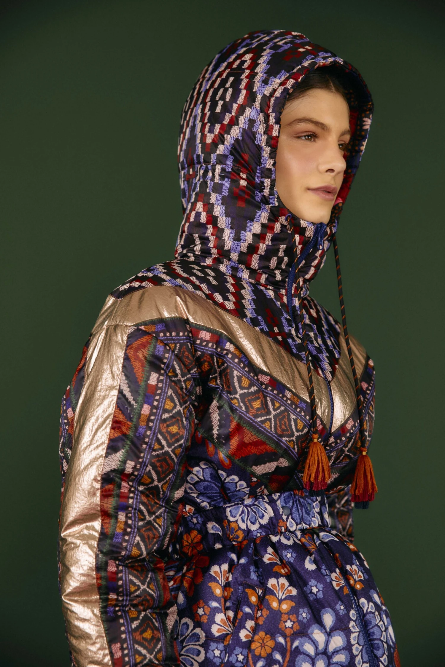 - High neck with hoodie, ties, and tassels