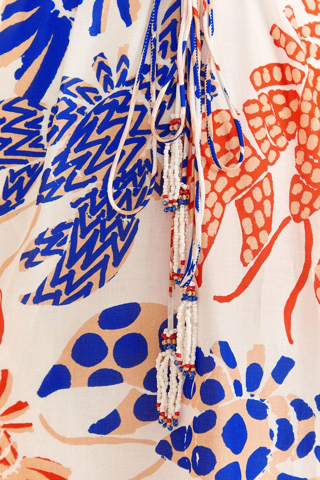 Straight from the bright sea to your solar wardrobe: the Off-White Mixed Lobsters Midi Dress is a timeless pick to enjoy Summer on repeat! It features an easy-breezy silhouette bringing an adjustable waistline with beaded tassels, a plunging neckline to show more skin, and a flowy skirt to follow your bold moves in every place, every wear. All your fresh shoes and accessories are allowed to join this one-of-a-kind look to sun-shine all around.